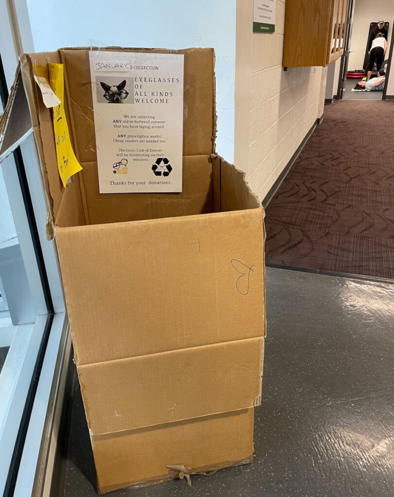 Since 2004, she and Jim have lived near the Montclair Recreation Center in Lowry’s north neighborhood. Montclair Rec Center regulars will be familiar with the big cardboard collection box to the left of the lobby doors when you walk in. That’s another Sally thing.