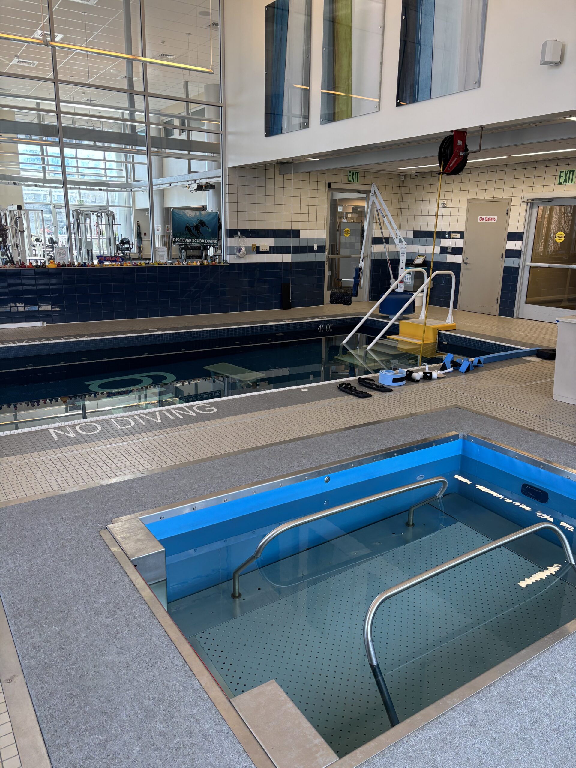 The PT on my shift has been working in the Craig pool for 20+ years, and she’s one of the best PTs (pool or dry land) in the hospital. Her only downside … she’s a very proud University of Florida alum and an overzealous Gators fan. And yes, we do get snarky with each other sometimes but rarely with the patients … unless they deal the snark first and then it’s game-on.